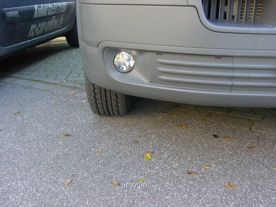 Fertig verbautes Kurvenlicht. Optisch kaum von den normalen Nebelscheinwerfern zu unterschieden. Die Montageplatte sitzt hinter der Blende...